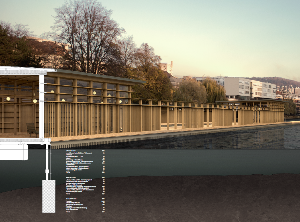 The proximity to the water is essential for the expression of the project and the well-being of the visitors. Since the Limmat causes significant fluctuations in the water level, the pool is planned as a floating raft construction. The construction consists of a filigree wooden construction with a characteristic structure. The deep horizontal struts reinforce the supports and at the same time serve as fixed sun protection. The sliding lamellar shade elements offer additional protection.